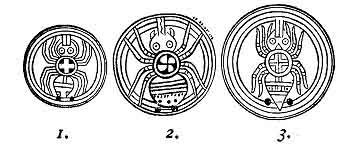 SPIDERS.--While the great Serpent Mounds have captured the most public interest among the Mound Builders' relics, the Spiders have the greatest fascination for me, personally. While exploring among the South Sea Islands some fifty years ago I constantly came across legends about the Grey and Black Pointed Spider. These legends showed that the Spider was symbolic of something, and that it was a sacred symbol,