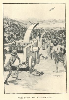 With a roar the crowd acknowledged the success of their device, and bellowed out insults to Phorenice, and insults to the Gods: a poor frantic crowd they showed themselves. And then with ravening shouts they fell upon the other captive warder, binding him also into a compact, helpless missile, and meanwhile getting the engine into gear again for another shot.