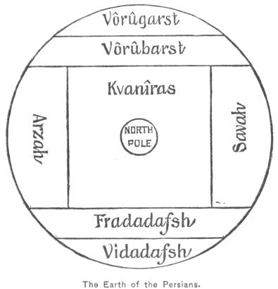 159:1 Darmesteter transliterates the names as follows: "The earth is divided into seven Karshvares, separated from one another by seas and mountains impassable to men. Arezahi and Savahi are the western and eastern Karshvare; Fradadhafshu and Vidadhafshu are in the south; Vourubaresti and Vourugarsti are in the north; Hvaniratha (Kvanîras) is the central Karshvare. Hvaniratha is the only Karshvare inhabited by man (Bundahish, xi. 3)."Darmesteter, The Zend-Avesta, vol. ii., p. 123 n.
