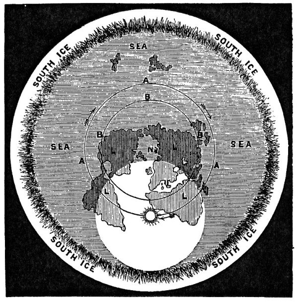 The whole of these explanations have reference only to the region between the sun and the northern centre. It is evident that in the great encircling oceans of the south, and the numerous islands and parts of continents, which exist beyond that part of the earth where the sun is vertical, cannot have their days and nights, seasons, &c., precisely like those in the northern region. The north is a centre, and the south is that centre radiated or thrown out to a vast oceanic circumference, terminating in circular walls of ice, which form an impenetrable frozen barrier. Hence the phenomena referred to as existing in the north must be considerably modified in the south, For instance, the north being central, the light of the sun advancing and receding, gives long periods of alternate light and darkness at the actual centre; but in the far south, the sun, even when moving in his outer path, can only throw its light to a certain distance, beyond which there must be perpetual darkness. No evidence exists of there being long periods of light and darkness regularly alternating, as in the north. In the north, in summer-time, when the sun is moving in its inner path, the light shines continually for months together over the central region, and rapidly develops numerous forms of animal and vegetable life.