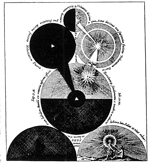 The Supreme Deity is symbolized by the small globe at the top, which is divided into two hemispheres, the dark half representing the divine darkness with which the Deity surround Himself and which serves as His hiding place. The radiant hemisphere signifies the divine light which is in God and which, pouring forth, manifests as the objective creative power. The large dark globe to the left and beneath the dark half of the upper sphere signifies the potential darkness which was upon the face of the primordial deep and within which moved the Spirit of God. The light globe to the right is the Deity who is revealed out of the darkness. Here the shining Word has dissipated the shadows and a glorious universe has been formed. The divine power of this radiant globe is cognizable to man as the sun. The large light and a dark section represents the created universes partaking of the light and darkness which are in the nature of the Creator. The dark half represents the Deep, or Chaos, the Eternal Waters pouring forth out of the Deity; the light half-circle containing the figure of Apollo represents the diurnal hemisphere of the world, which in the ancient Mysteries was ruled over by Apollo. The dark half-circle is the nocturnal hemisphere ruled over by Dionysius (Dionysos), whose figure is faintly visible in the gloom.