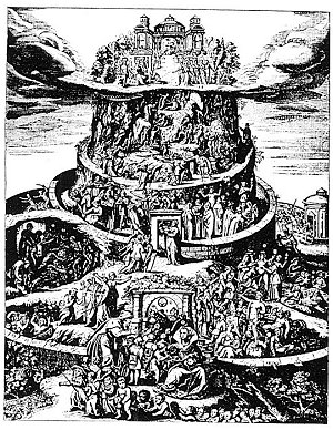 There is legend to the effect that the Tablet of Cebes, a dialogue between Cebes and Gerundio, was based upon an ancient table set up in the Temple of Kronos at Athens or Thebes which depicted the entire progress of human life. The author of the Tablet of Cebes was a disciple of Socrates, and lived about 390 B.C. The world is represented as a great mountain. Out of the earth at the base of it come he myriads of human creatures who climb upward in search of truth and immortality. Above the clouds which conceal the summit of the mountain is the goal of human attainment--true happiness. The figures and groups are arranged as follows: (1) the door of the wall of life; (2) the Genius or Intelligence; (3) deceit (4) opinions, desires, and pleasures; (5) fortune; (6) the strong; (7) venery, insatiability, flattery; (8) sorrow; (9) sadness; (10) misery; (11) grief, (12) rage or despair; (13) the house of misfortune; (14) penitence; (15) true opinion; (16) false opinion; (17) false doctrine; (18) poets, orators, geometers, et. al.; (19) incontinence, sexual indulgence, and opinion; (20) the road of the true doctrine (21) continence and patience; (22) the true doctrine; (23) truth and persuasion; (24) science and the virtues; (25) happiness, (26) the highest (first) pleasure of the wise man; (27) the lazy and the strays.
