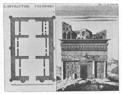 went on a voyage to Egypt, and, in the book in which he subsequently published the account of his travels, gives us some idea of the state of the remains in his time, but his account is very rambling and unreliable. Fig. 1 is a view which he gives of part of the ruins of the alleged labyrinth.
