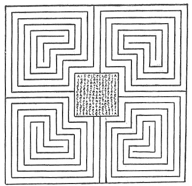 Probably the oldest known example of this nature is that in the ancient basilica of Reparatus at Orléansville (Algeria), an edifice which is believed to date from the fourth century A.D. In the pavement near the north-west entrance of the church is the design shown in outline in Fig. 42. It measures about 8 ft. in diameter and shows great resemblance to the Roman pavement found at Harpham and the tomb-mosaic at Susa. At the centre is a jeu-de-lettres on the words SANCTA ECLESIA, which may be read in any direction, except diagonally, commencing at the centre. But for the employment of these words the labyrinth in question might well have been conceived to be a Roman relic utilised by the builders of the church to ornament their pavement. Such pavement-labyrinths, however, with or without central figures or other embellishments, and of various dimensions and composition, are found in many of the old churches of France and Italy.