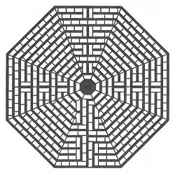 Of about the same period was the example in the church of San Savino at Piacenza. It is described by P. M. Campi in his "Ecclesiastical History of Piacenza" (1651), under the year A.D. 903. The signs of the Zodiac were placed in juxtaposition to it. The accompanying legend in this case consisted of four hexameters, to the effect that the labyrinth represented the world we live in, broad at the entrance, but narrow at the exit, so that he who is ensnared by the joys of this world, and weighed down by his vices, can regain the doctrine of life only with difficulty.