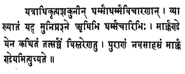 7. Márkańd́a or Márkańd́eya Puráńa. "That Puráńa in which, commencing with the story of the birds that were acquainted with right and wrong, every thing is narrated fully by Márkańd́eya, as it was explained by holy sages in reply to the question of the Muni, is called the Márkańd́eya, containing nine thousand verses 55." This is so called from its