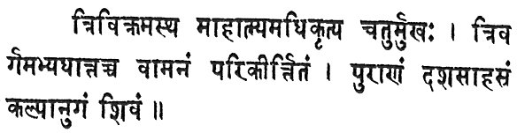 14. Vámana Puráńa. "That in which the four-faced Brahmá taught the three objects of existence, as subservient to the account of the greatness of Trivikrama, which treats also of the Śiva Kalpa, and which consists of ten thousand stanzas, is called the Vámana Puráńa 74."