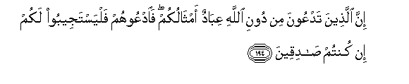 194. Inna allatheena tadAAoona min dooni Allahi AAibadun amthalukum faodAAoohum falyastajeeboo lakum in kuntum sadiqeena