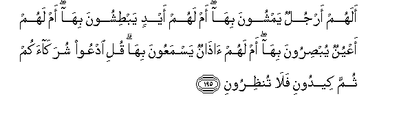 195. Alahum arjulun yamshoona biha am lahum aydin yabtishoona biha am lahum aAAyunun yubsiroona biha am lahum athanun yasmaAAoona biha quli odAAoo shurakaakum thumma keedooni fala tunthirooni