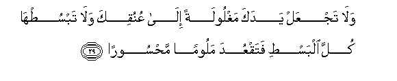 29. Wala tajAAal yadaka maghloolatan ila AAunuqika wala tabsutha kulla albasti fataqAAuda malooman mahsooran