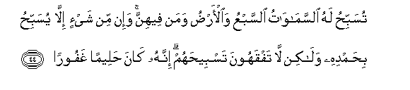44. Tusabbihu lahu alssamawatu alssabAAu waal-ardu waman feehinna wa-in min shay-in illa yusabbihu bihamdihi walakin la tafqahoona tasbeehahum innahu kana haleeman ghafooran