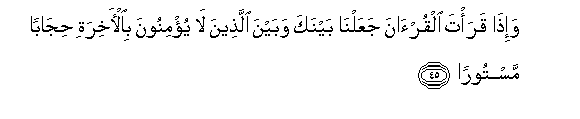 45. Wa-itha qara/ta alqur-ana jaAAalna baynaka wabayna allatheena la yu/minoona bial-akhirati hijaban mastooran