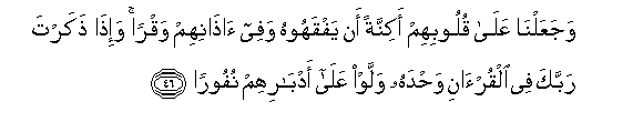 46. WajaAAalna AAala quloobihim akinnatan an yafqahoohu wafee athanihim waqran wa-itha thakarta rabbaka fee alqur-ani wahdahu wallaw AAala adbarihim nufooran