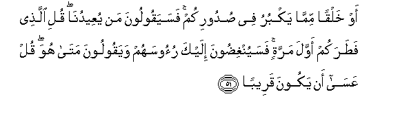 51. Aw khalqan mimma yakburu fee sudoorikum fasayaqooloona man yuAAeeduna quli allathee fatarakum awwala marratin fasayunghidoona ilayka ruoosahum wayaqooloona mata huwa qul AAasa an yakoona qareeban