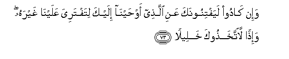 73. Wa-in kadoo layaftinoonaka AAani allathee awhayna ilayka litaftariya AAalayna ghayrahu wa-ithan laittakhathooka khaleelan