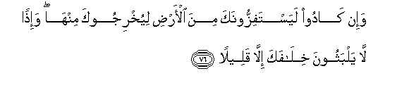 76. Wa-in kadoo layastafizzoonaka mina al-ardi liyukhrijooka minha wa-ithan la yalbathoona khilafaka illa qaleelan