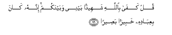 96. Qul kafa biAllahi shaheedan baynee wabaynakum innahu kana biAAibadihi khabeeran baseeran