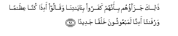 98. Thalika jazaohum bi-annahum kafaroo bi-ayatina waqaloo a-itha kunna AAithaman warufatan a-inna lamabAAoothoona khalqan jadeedan