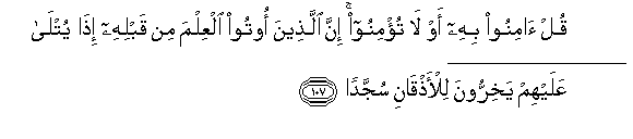 107. Qul aminoo bihi aw la tu/minoo inna allatheena ootoo alAAilma min qablihi itha yutla AAalayhim yakhirroona lil-athqani sujjadan