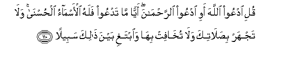110. Quli odAAoo Allaha awi odAAoo alrrahmana ayyan ma tadAAoo falahu al-asmao alhusna wala tajhar bisalatika wala tukhafit biha waibtaghi bayna thalika sabeelan