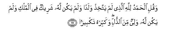 111. Waquli alhamdu lillahi allathee lam yattakhith waladan walam yakun lahu shareekun fee almulki walam yakun lahu waliyyun mina alththulli wakabbirhu takbeeran