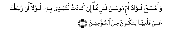 10. Waasbaha fu-adu ommi moosa farighan in kadat latubdee bihi lawla an rabatna AAala qalbiha litakoona mina almu/mineena
