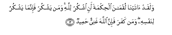 12. Walaqad atayna luqmana alhikmata ani oshkur lillahi waman yashkur fa-innama yashkuru linafsihi waman kafara fa-inna Allaha ghaniyyun hameedun