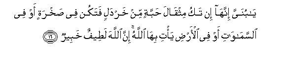 16. Ya bunayya innaha in taku mithqala habbatin min khardalin fatakun fee sakhratin aw fee alssamawati aw fee al-ardi ya/ti biha Allahu inna Allaha lateefun khabeerun