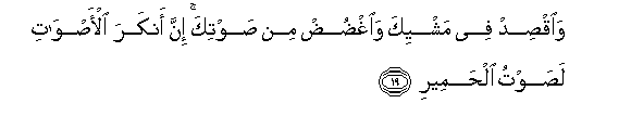 19. Waiqsid fee mashyika waoghdud min sawtika inna ankara al-aswati lasawtu alhameeri