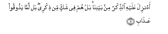 8. Aonzila AAalayhi alththikru min baynina bal hum fee shakkin min thikree bal lamma yathooqoo AAathabi