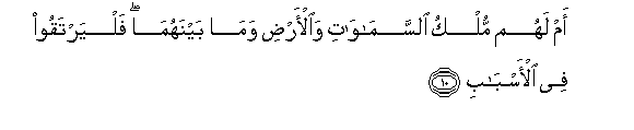 10. Am lahum mulku alssamawati waal-ardi wama baynahuma falyartaqoo fee al-asbabi