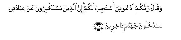 60. Waqala rabbukumu odAAoonee astajib lakum inna allatheena yastakbiroona AAan AAibadatee sayadkhuloona jahannama dakhireena