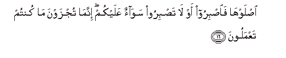 16. Islawha faisbiroo aw la tasbiroo sawaon AAalaykum innama tujzawna ma kuntum taAAmaloona