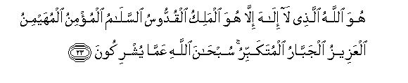 23. Huwa Allahu allathee la ilaha illa huwa almaliku alquddoosu alssalamu almu/minu almuhayminu alAAazeezu aljabbaru almutakabbiru subhana Allahi AAamma yushrikoona
