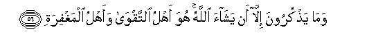 56. Wama yathkuroona illa an yashaa Allahu huwa ahlu alttaqwa waahlu almaghfirati