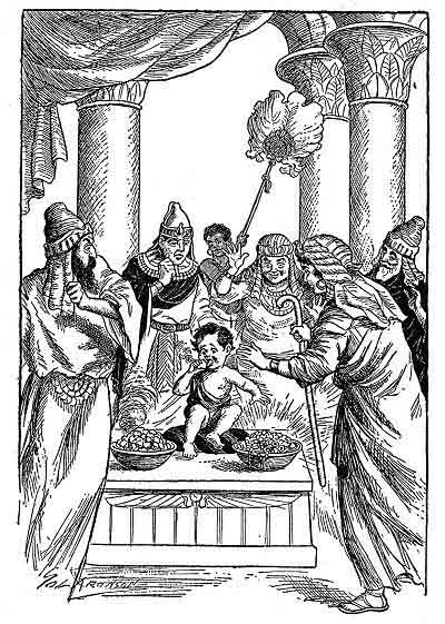 He was a pretty little boy, full of fun and frolic as he grew up, and he became a favorite with everybody in the palace. Even the cruel King Pharaoh, who had ordered that all the Hebrew boy babes should be drowned, loved to play with him. His ministers of state and magicians, however, frowned when they saw Moses, as soon as he could toddle and talk, making a play-mate of the king. They warned Pharaoh that it was dangerous to give a strange child such privileges, but Princess Bathia only laughed at them. So did her mother, the queen, and King Pharaoh took no notice.