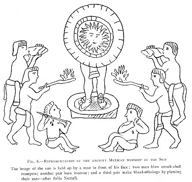 The image of the sun is held up by a man in front of his face; two men blow conch-shell trumpets; another pair burn incense; and a third pair make blood-offerings by piercing their earsafter Zelia Nuttall.