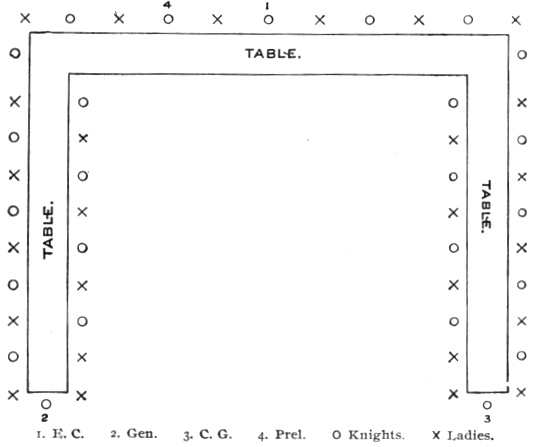 De not form a Passion Cross with the tables. That cross is a sacred symbol in the Order of the Temple, and is not associated with the hilarity usual to a Banquet. The following form is suggested. It is very desirable that the banqueters sit as compactly as possible, and close up to the Commander, so as to be easily governed at proper intervals.
