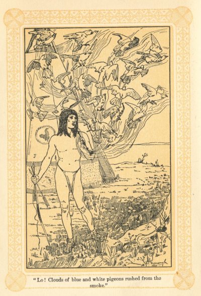 His grandfather, who was at work not far from the wigwam, was astonished to see flocks of pigeons flying over his head, and still more surprised to find that they came from his own doorway. When he went in and saw the boy wearing the white feather, he knew what it all meant and became very sad, for he loved the boy so much that he could not bear the thought of losing him.