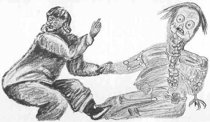 And now Nukúnguasik went up to them, and there lay the Tupilak, still alive, and nibbling at the body of the dead man. But the brothers buried him there, making a mound of stones above him. And then they went home.