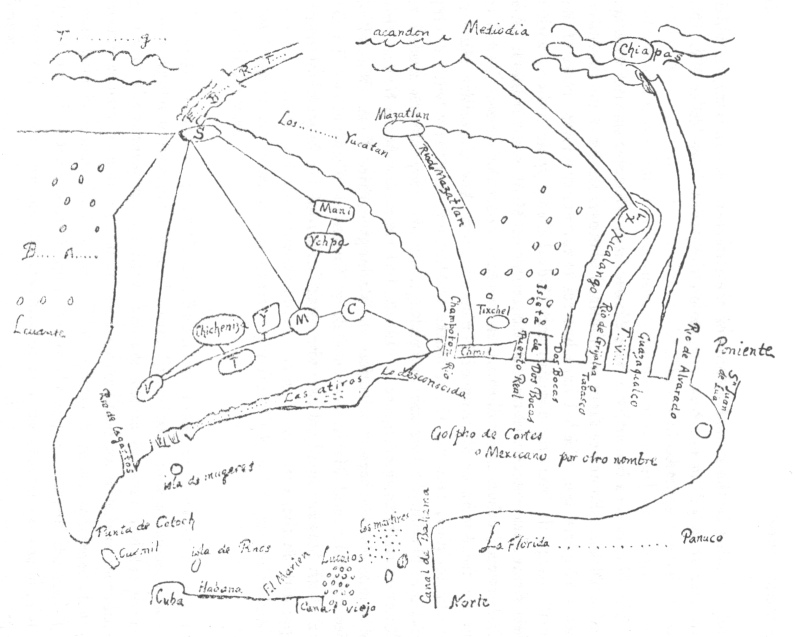 The island of Mugeres is xiii or xiiii leagues below the point of Cotoch, separated from toracolvo (?) two leagues. Chicheniza is ten leagues from Izamal and xi from Valladolid.