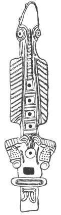 They have whistles of cane and of deer hones, also large conchs and reed flutes; with these instruments they accompany the dancers. Two of their dances are especially virile and worth seeing; one is a game of reeds, whence they call it colomché, the word having that meaning [a 'palisade of sticks']. To perform it they make a large circle of dancers, whom the music accompanies, and in time with which two come into the circle; one of these dances erect, holding a handful of reeds, while the other dances squatting, both keeping time around the circle. The one with the reeds throws them with all his force at the other, who with great skill catches them with a shall rod. them all are thrown they return, keeping time, into the circle, and others come out to do the same.
