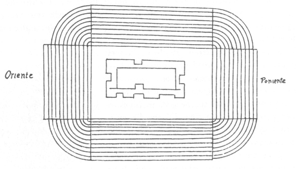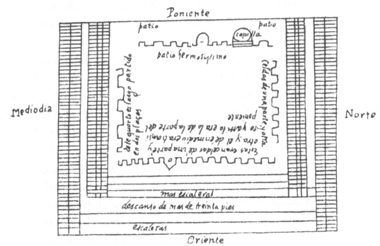 On the East, stairway, platform of more than 30 feet; then more stairs. At the South, a long apartment, divided; at the North, another, same. At the West another range broken by an arcade, and with a chapel, and patios in front and behind. In the center a great patio, between the two ranges, each made up of rooms, broken by arcades.