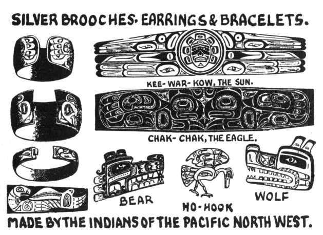 This talented Indian artist extended the arts of the tribes by his design, some of which have been used to illustrate this book. The originals were first painted on spruce boards and cottonwood veneer. Eight of the former now hang on the wall of the Lipsett Memorial at Hastings Park Exhibition Grounds and eight adorn the Vancouver City Museum. A twelve foot Thunderbird totem pole and some others were carved by Mr. James for the author of this work through the years of their friendship.