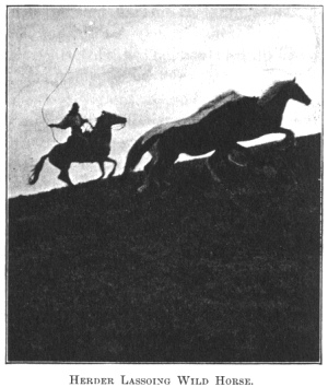 was always before him, so that he was unable to sleep. He dreaded hearing a rider enter the camp, lest it might be one of the Mounted Police coming to arrest him. He became morose and gloomy and shunned his friends, imagining that all had turned against him. He thought he must be going mad and desired to live no longer. Resolved to die the death of a brave, he vowed he would kill as many people as he could, both Indian and white. Passing the store at night, and seeing the trader standing near a window, he raised his rifle and fired. He saw the trader fall forward upon his face and then fled in the darkness. Returning to his lodge, he told his wives that he had shot a white man, and he must hide in the mountains. The lodge was quickly taken down, and their belongings packed upon a travois. Opiowan put on his war charm and, painting his face, chanted a war song. They entered the Rocky Mountains, camping in a small glade, where their lodge was hidden by the trees. When the Mounted Police heard of Opiowan's escape, they knew he must be the murderer and followed his trail. But Opiowan, watching from a neighbouring cliff, saw them coming. Knowing they would enter the glade from below, he left his mother and son in the lodge and with his wives circled through the forest. The police tied their horses at the lower end of the glade and advanced on foot. They shot into the lodge, but the boy and woman lay flat and were not hit. Opiowan then came quickly from the forest and made off with their horses. The police captured the old mother and the boy and withdrew, after destroying the lodge, but Opiowan, with his two wives, escaped by going northward along the Rockies. When they came to the country of the North Piegans, they entered the Porcupine Mountains and hid