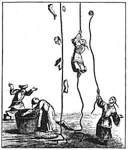 Parallels.—Campbell gives another variant, l.c. i. 318. Dr. Hyde has an Irish version of Campbell's tale written down in 1762, from which he gives the incident of the air-ladder (which i have had to euphemise in my version) in his Beside the Fireside, p.191, and other passages in his Preface. The most remarkable parallel to this incident, however, is afforded by the feats of Indian jugglers reported briefly by Marco Polo, and illustrated with his usual wealth of learning by the late Sir Henry Yule, in his edition, vol. i. p.308 seq. The accompanying illustration (reduced from Yule) will tell its own tale: it is taken from the Dutch account of the travels of an English sailor, E. Melton, Zeldzaame Reizen, 1702, p.468. It tells the tale in five acts, all included in one sketch. Another instance quoted by Yule is still more parallel, so to speak. The twenty-third trick performed by some conjurors before the Emperor Jahangueir (Memoirs, p. 102) is thus described: "They produced a chain of 50 cubits in length, and in my presence threw one end of it towards the sky, where it remained as if fastened to something in the air. A dog was then brought forward, and being placed at the lower end of the chain, immediately