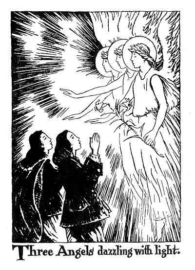 The two brothers, awestruck, fell on their knees. Then one of the angels, the most handsome and most beautifully robed, approached the younger brother, and, bending over him, said: