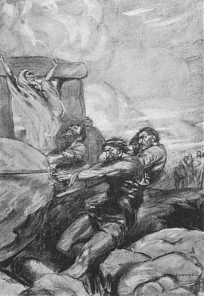 which they are painfully dragging toward a deep pit situated at the end of one of the enormous alleys of monoliths. On rudely shaped rollers rests a huge stone some twenty feet in length, and this they drag across the rough moor by ropes of hide, lightening their labours by the chant, which relates the exploits of the warrior-chief who has lately been entombed in this vast pantheon of Carnac. The menhir shall serve for his headstone. It has been vowed to him by the warriors of his tribe, his henchmen, who have fought and hunted beside him, and who revere his memory. This stone shall render his fame immortal.