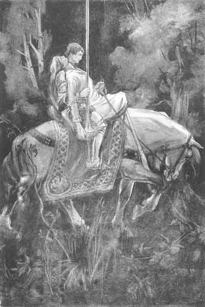 The King of Brittany went to war with a neighbouring monarch, and Graelent bore himself manfully in the conflict, leading his troops again and again to victory. Hearing of his repeated successes, the Queen was exceedingly mortified, and made up her mind to destroy his popularity with the troops. With this end in view she prevailed upon the King to withhold the soldiers' pay, which Graelent had to advance them out of his own means. In the end the unfortunate knight was reduced almost to beggary by this mean stratagem. One morning he was riding through the town where he was lodged, clad in garments so shabby that the wealthy burgesses in their fur-lined cloaks and rich apparel gibed and jeered at him, but Graelent, sure of his own worth, deigned not to take notice of such ill-breeding. and for his solace quitted the crowded streets of the place and took his way toward the great forest which skirted it. He rode into its gloom deep in thought, listening to the murmur of the river which flowed through the leafy ways.