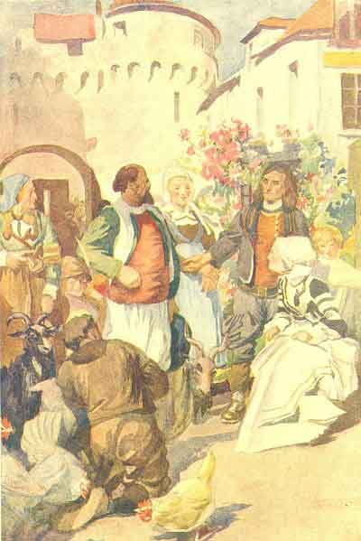 In many of their religious observances the Bretons are prone to confuse the sacred with the profane, and chief among these is the wedding ceremony--the customs attendant on which in some ostensibly Christian countries are yet a disgrace to the intellect as well as the good feeling of man. In rural Brittany, however, the revelry which ensues as soon as the church door closes on the newly wedded pair is more like that associated with a children's party than the recreation of older people. Should the marriage be celebrated in the morning, tables laid out with cakes are ranged outside the church door, and when the bridal procession files out of the church the bride and bridegroom each take a cake from the table and leave a coin in its stead for the poor. The guests follow suit, and then the whole party repairs to the nearest meadow, where endless ronds are begun.